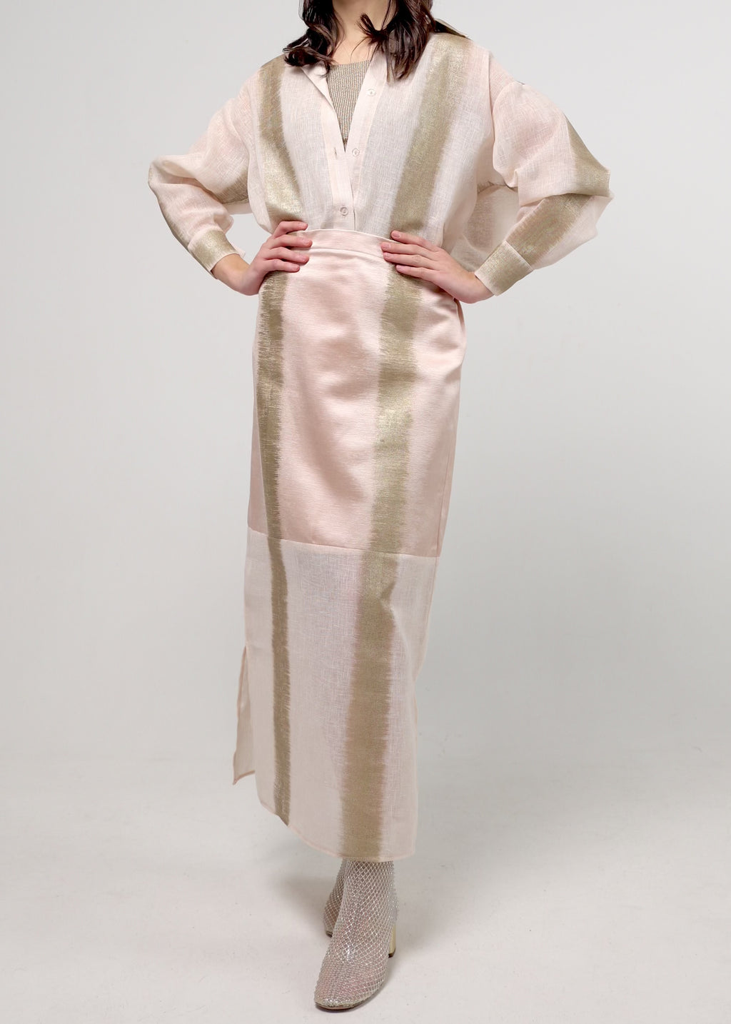 A sleek set in soft pink, accented with bold golden brushstroke details that create a striking yet refined look.