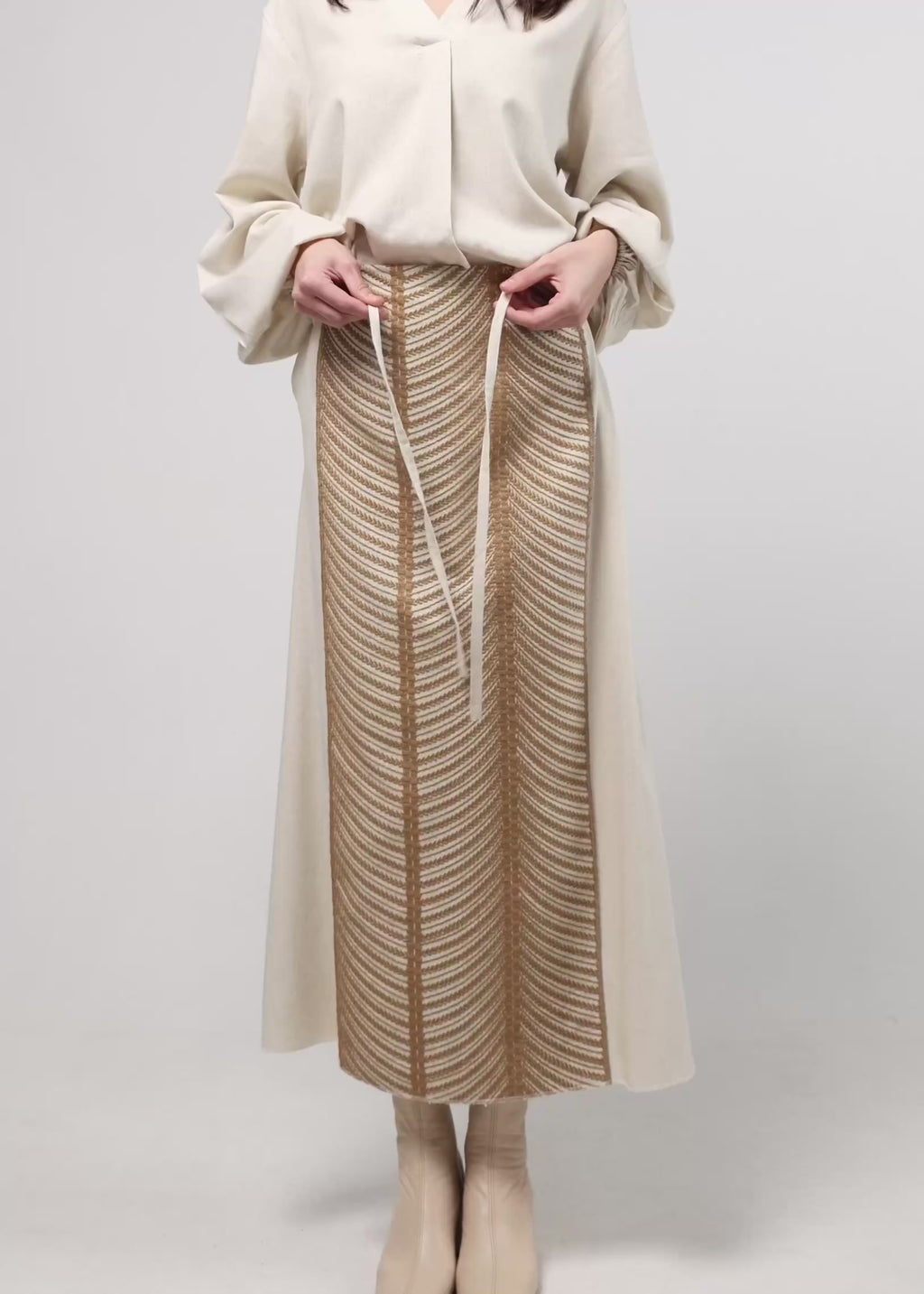 A linen midi skirt detailed with intricate embroidery that creates a refined, textured finish. Paired with a v neck linen top.
