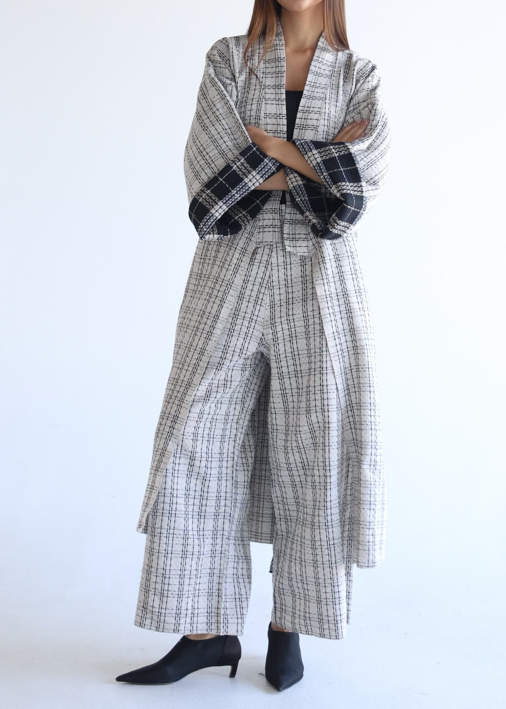 A wide leg trousers and kimono style overlay create an effortless silhouette, elevated by intricate patterned trims and a tie back belt. A modern nod to timeless heritage.