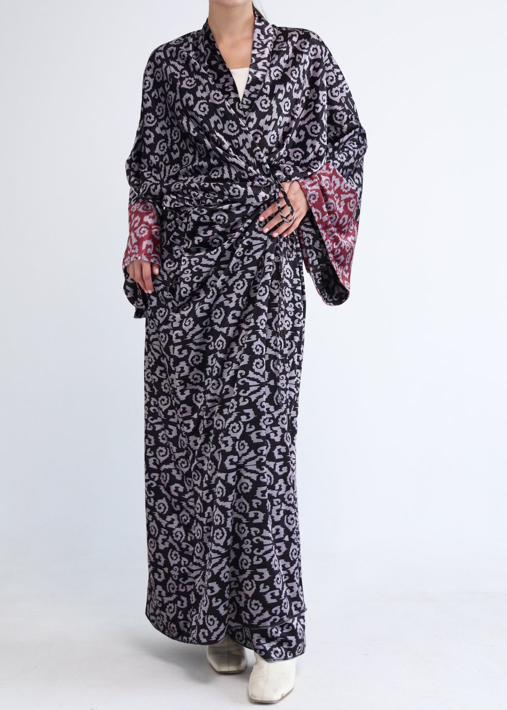 Long printed kimono-style abaya with a subtle black and rose gradient. Features wide sleeves and a belted waist for an effortless, elegant silhouette.