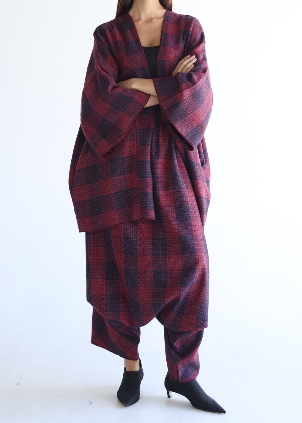 A relaxed plaid set in deep rust and black tones, featuring a wide-sleeved top and draped trousers for a bold, effortless look.