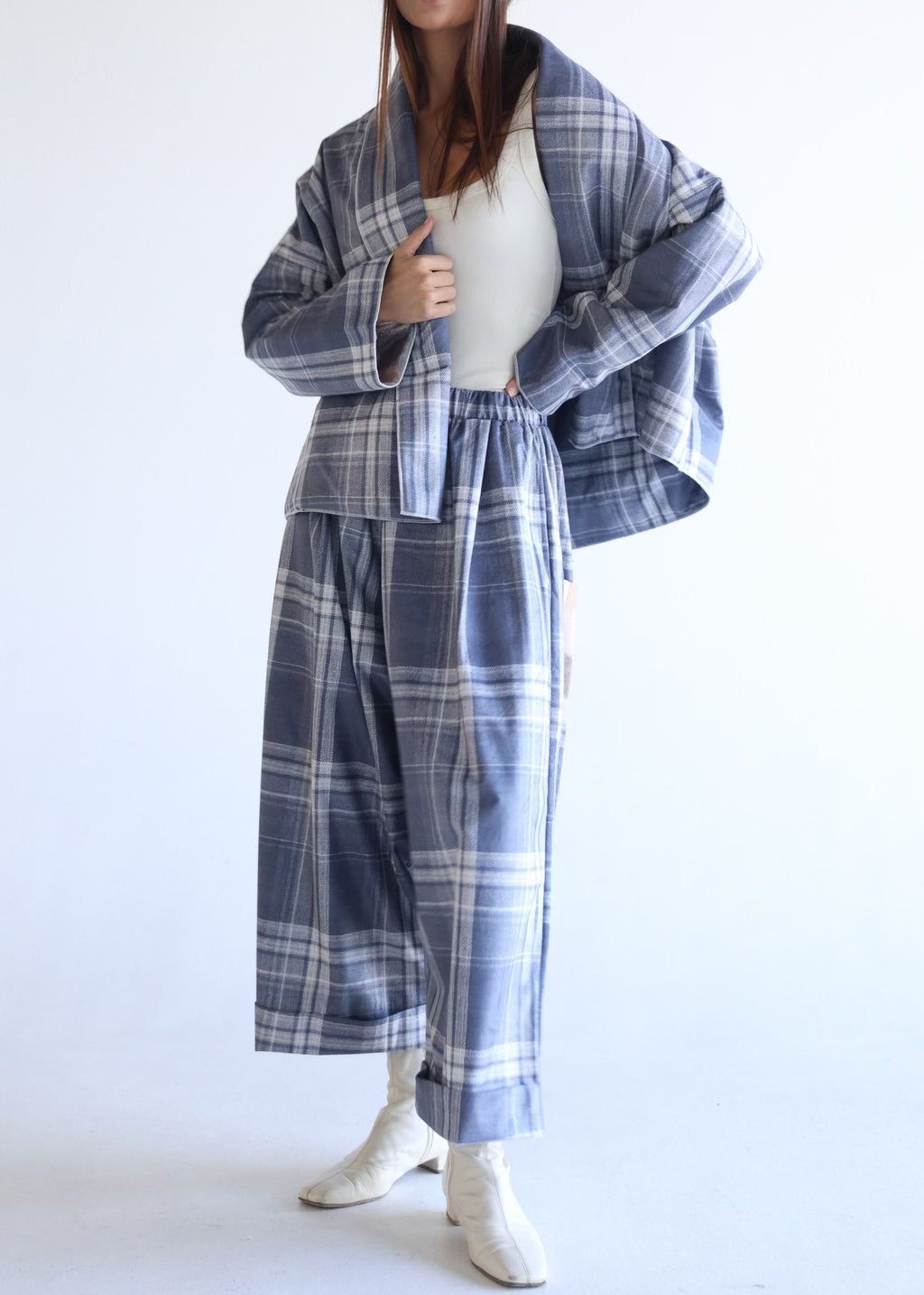 Blue plaid harem pants with an elastic waistband, loose fit, and tapered ankles. Lightweight fabric with soft drape and comfortable movement.