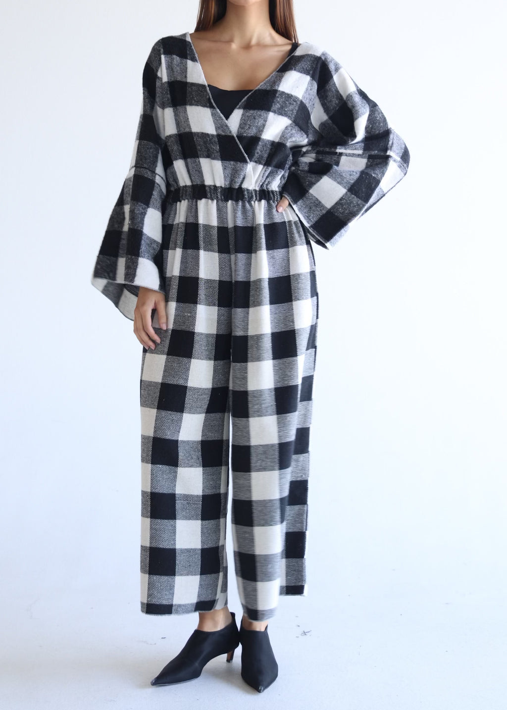 Black and white checkered jumpsuit with a wrap neckline, elastic waist, and wide sleeves for a relaxed fit.