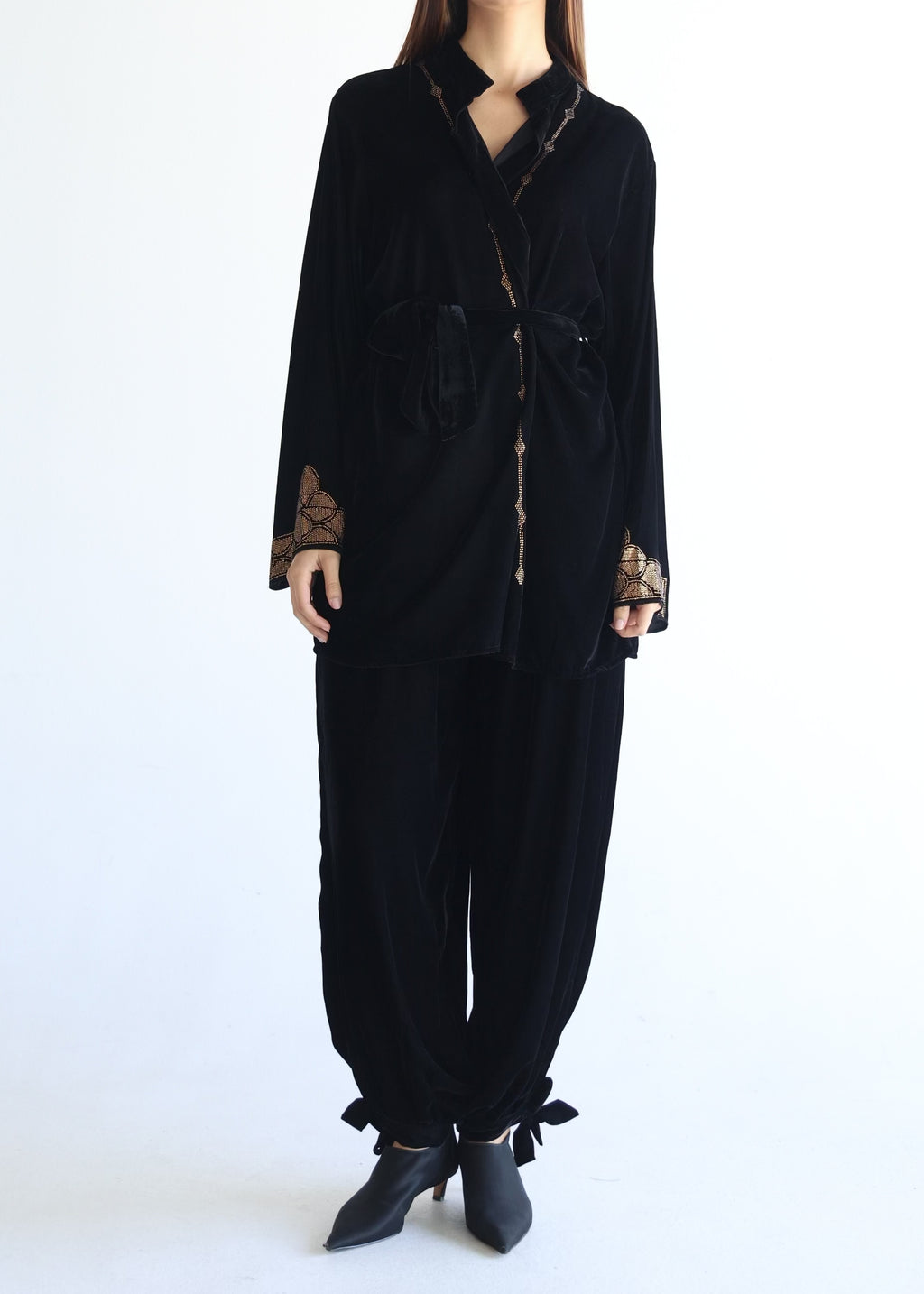 A black velvet set detailed with rich golden embroidery, blending traditional motifs with a modern, regal silhouette.