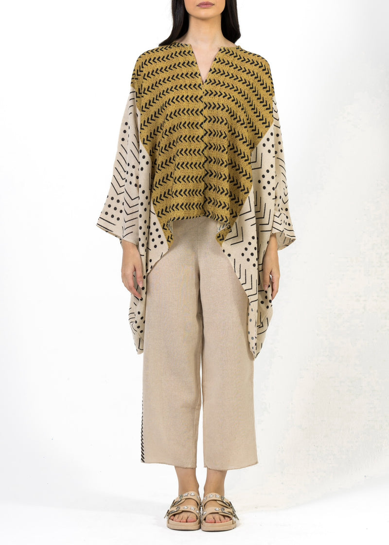 This ensemble features a beige poncho-style top with a V-neck cut and asymmetrical hem. It is adorned with contrasting geometric patterns in black and mustard, and paired with beige wide-legged cropped pants for a modern, artistic look.