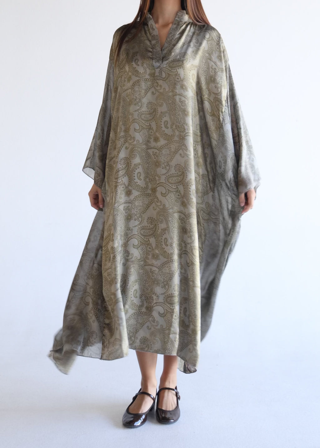 A flowy paisley-print kaftan in soft golden tones, offering effortless elegance and comfort.